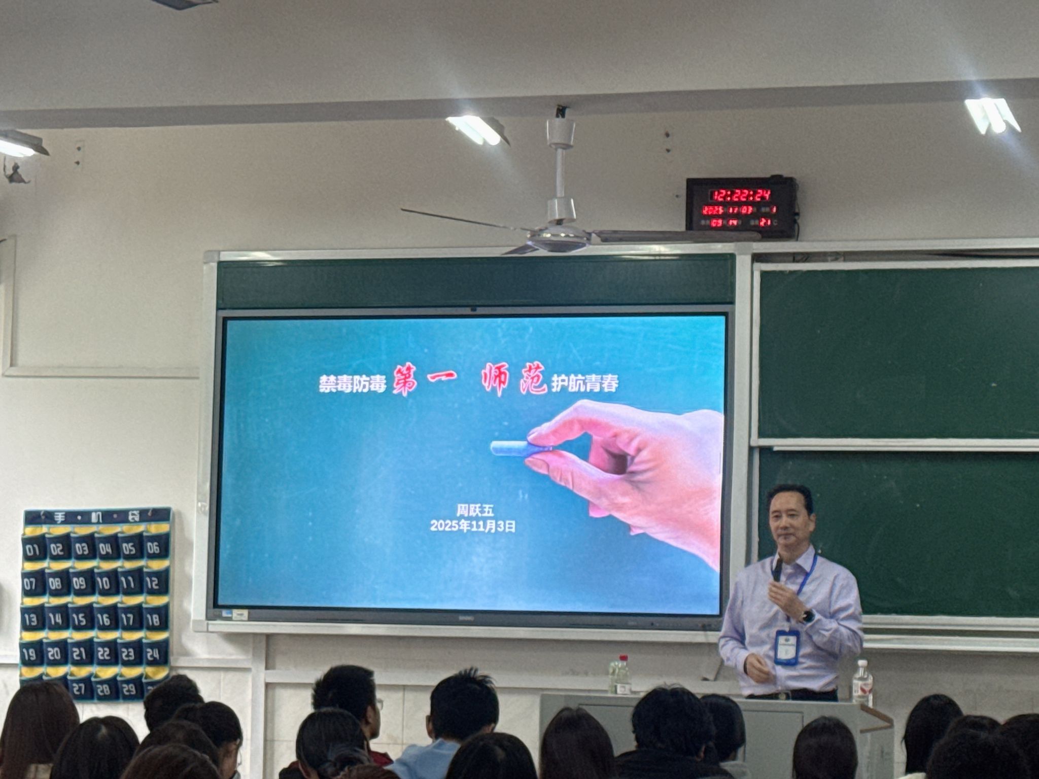讲座伊始,周跃五以“理论讲解+案例剖析”的形式切入,系统梳理了传统毒品、合成毒品及新精神活性物质的分类特征。通过展示鸦片、海洛因等传统毒品样本,以及伪装成“奶茶粉”“跳跳糖”“电子烟”的新型毒品仿真模型,直观揭露了毒品的隐蔽性与欺骗性。他结合近年的真实案例,详细解读了毒品对中枢神经系统、免疫系统的不可逆损伤,以及“吸毒违法,贩毒有罪”的法律底线,用“一次尝试,终身悔恨”的惨痛教训敲响警钟。针对学生特色,他特别警示“职场提神药”“聚会电子烟”等涉毒陷阱,传授“不接受陌生人馈赠、不进入治安复杂场所”的自护原则。